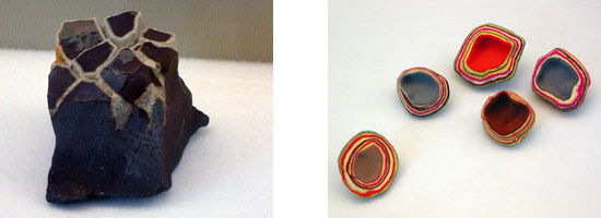 Twee “gesteenten” vielen mij op tijdens mijn ronde door het Teylers Museum. De doorsnede van de Limoniet/Dolomiet met zijn gelaagde randen en de wirwar van de ruitvormige en mat grijze Calciumkristallen.