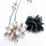Floor Max zegt over haar werk: “Onderzoek naar hoe dun en fragiel materiaal stevigheid krijgt, is een permanent gegeven in de ruim 25 jaar dat ik sieraden ontwerp en vervaardig. Ik maak holle vormen die ik zowel abstract als figuratief gebruik. Kommetjes kunnen zich openen als de blaadjes van een jasmijn, zich sluiten als een klont mossels of gewoon een sterke bol vormen.” Dit allemaal is te zien in hangers en oorhangers die geïnspireerd zijn op verschillende collecties uit het verleden.