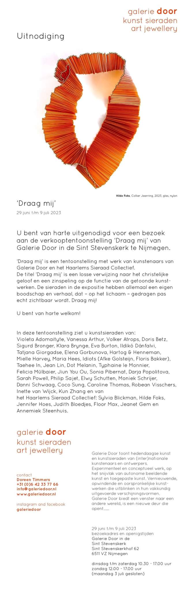 Uitnodiging Draag Mij – Carry Me, Galerie Door en het HSC in de Stevenskerk te Nijmegen, 29 juni 2023 t/m 9 juli 2023 Uitnodiging Draag Mij – Carry Me, Galerie Door en het HSC in de Stevenskerk te Nijmegen, 29 juni 2023 t/m 9 juli 2023