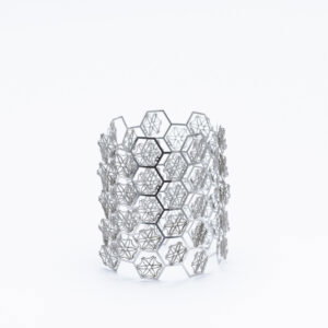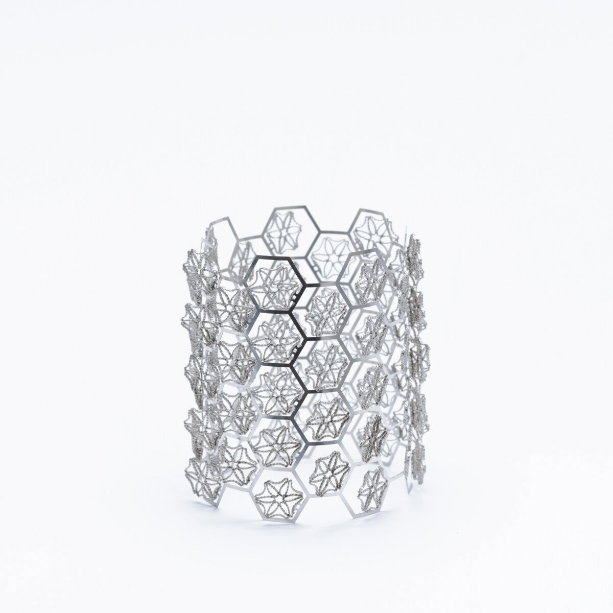 Eva van Kempen Hexagon 2025 Armband, roestvrij staal Filigrein in laser gesneden frame i.s.m. TU Delft foto Hugo Rompa