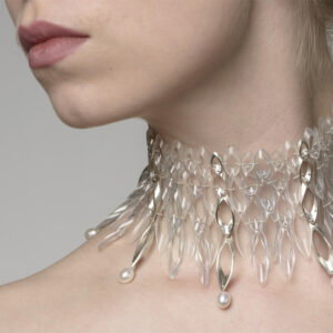 Eva van Kempen, Schuine plakjes, 2017 Afgekeurde ziekenhuissnoeren, zilver, zoetwaterparels. Serie Klaar om te dragen foto Hugo Rompa