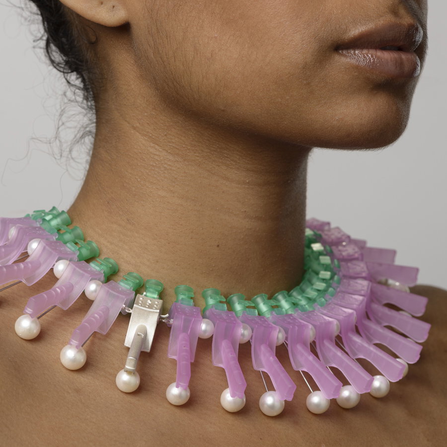 Eva van Kempen, Smartslip technology, 2015 Afgekeurde injectienaalden, zilver, zoetwaterparels Serie Lifelines foto Hugo Rompa