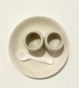 Annemiek toont sieraden en objecten(maskers) samengesteld uit vooral huishoudelijke gebruiksvoorwerpen van keramiek, glas en hout. Ze zijn onderdeel van een serie getiteld Objets Trouvés.